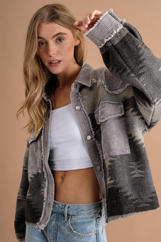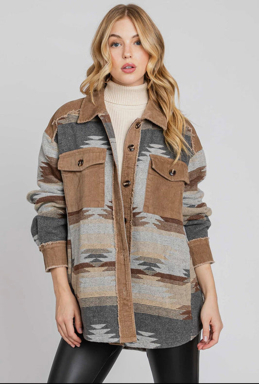 Western Aztec Striped Patchwork Raw Hem Shacket