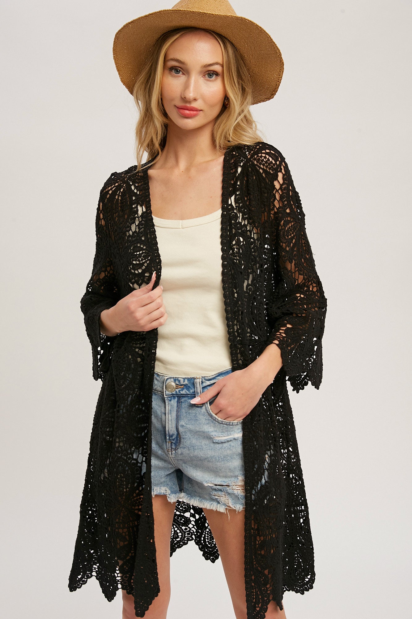 An open-knit crochet lace cardigan featuring an open front, 3/4 wide bell sleeves, oversized fit. Perfect for layering in the warmer weather or as a beach cover-up.