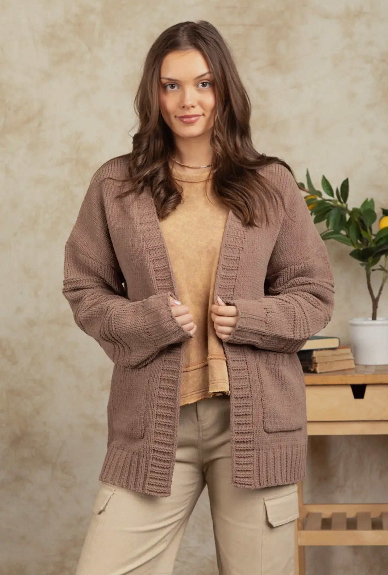 Exposed Seam Detail on arms. Open front w/side pockets! Ribbed Hem.